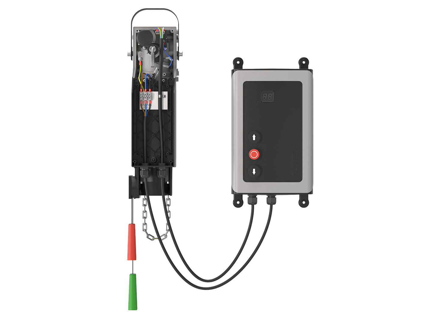 Комплект поставки автоматики: привод, блок управления, монтажный набор с монтажным кронштейном, удлинительные шнурки, руководство по монтажу и эксплуатации.